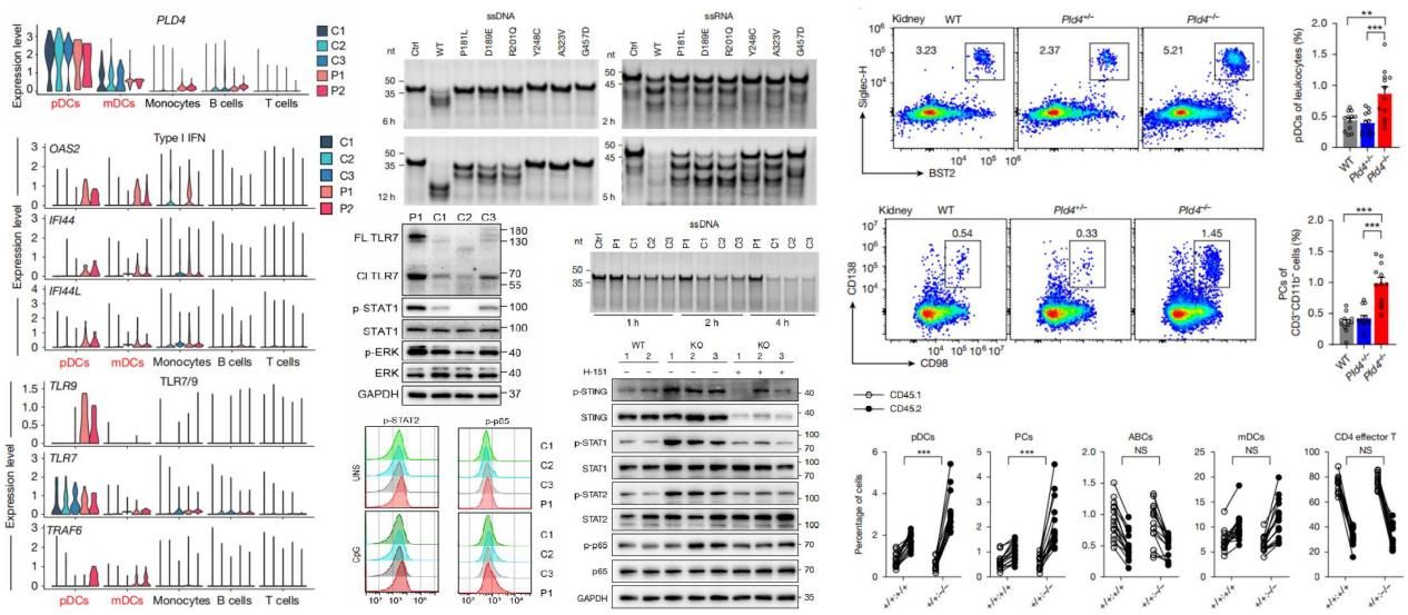 综上所述,本研究首次证实了PLD4功能缺失性突变可导致人类SLE,并深度解析了其驱动pDCs和浆细胞内在性功能失调导致自身免疫稳态失衡的核心致病机制。研究结果不仅解析了SLE遗传致病新机制,还为进一步理解机体免疫稳态维持机制和更加广泛地自身免疫性疾病的分子机制提供了理论依据,同时也为未来SLE的精准基因诊断及个体化治疗奠定了基础。