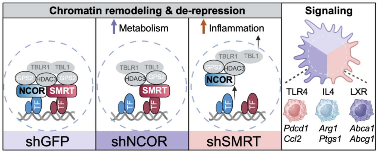 巨噬细胞是固有免疫的枢纽,在炎症反应、代谢稳态维持及多种疾病进程中发挥关键作用。转录因子及其共调控因子通过转录与表观遗传的耦合机制精细调控巨噬细胞的炎症与代谢通路,其中以HDAC3共阻遏复合物为核心枢纽。作为该复合物的关键支架与功能单元,SMRT与NCOR已被证实参与复合物装配、转录因子招募及染色质互作。然而,二者在巨噬细胞中的功能分工、调控特异性及其分子机制仍未明晰,构成当前领域亟待破解的核心科学问题。