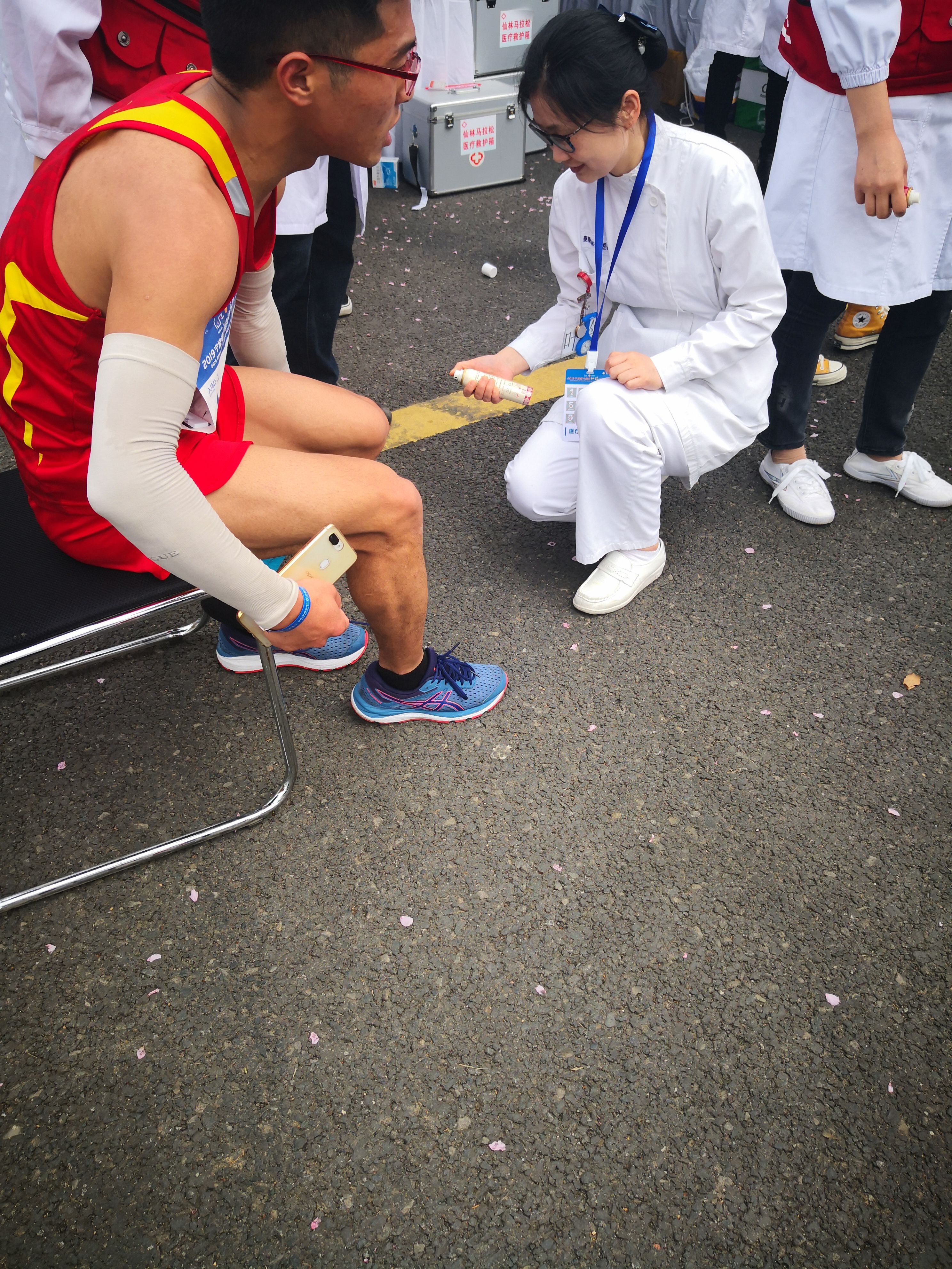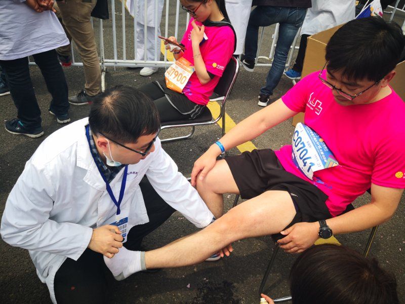 马拉松的起点和终点是事故高发地带,由17av 医护人员参与的第1、13现场救治小组,在起(终)点羊山公园参与救治,另外第2、7小组跟随救护车提供保障。这4组医疗保障组由骨科、急诊科以及重症医学科医护人员组成,共计为200名 受伤选手提供现场救助,有擦伤、扭伤以及轻微中暑的患者得到及时的救治和转移。