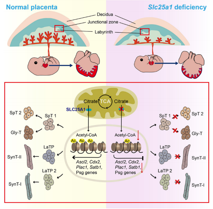 为了研究Slc25a1在心脏发育中的作用,他们培育出了全身敲除Slc25a1的小鼠,发现心脏发育出现异常及神经管闭合不全。于是,他们利用几个心脏特异表达Cre小鼠,在心脏组织中特异敲除Slc25a1。令人惊讶的是,这些小鼠并未出现心脏缺陷,表明 SLC25A1 在心脏组织细胞中并未发挥重要作用,提示胎盘发育异常可能是导致胚胎心脏发育缺陷发生的原因。接下来,他们培育出仅在胎盘组织中缺失 SLC25A1 蛋白的小鼠,他们发现这些小鼠既出现了胎盘缺陷,也出现了心脏发育缺陷。这表明 SLC25A1 在胎盘发育过程中起着关键作用,并进而指导胚胎心脏发育。通过单细胞 RNA 测序分析发现,Slc25a1的缺失影响胎盘滋养层细胞分化,尤其是海绵滋养层(SpT)和糖原滋养层(Gly-T)细胞,以及迷路滋养层祖细胞向合胞体滋养层(SynT)-I 和 SynT-II 细胞的分化。机制研究发现,SLC25A1 通过调节组蛋白 H3K27 乙酰化(H3K27ac)水平,影响调控滋养层发育关键基因启动子和增强子区域的 H3K27ac 占位,进而影响到这些基因的表达,指导滋养层细胞分化与胎盘发育,保证胚胎心脏的正常发育。此外,他们还发现妊娠特异性糖蛋白 1(PSG1)在 SLC25A1缺失胎盘中表达下调,给孕鼠补充人重组 PSG1 蛋白可部分挽救 SLC25A1缺失小鼠的胎盘和心脏发育表型。