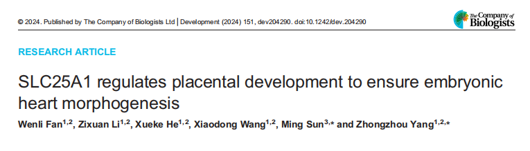 上述研究结果于近期发表于发育生物学领域重要期刊Development杂志,题目为“SLC25A1 regulates placental development to ensure embryonic heart morphogenesis”。该研究首次利用胎盘特异性敲除小鼠证明了胎盘形成相关基因对胚胎心脏发育的影响,加深了对“胎盘 - 心脏发育轴”的理解,为治疗胚胎心脏发育缺陷提供了新思路。该研究被选为Research Highlight,并配发了“文章背后的人物(The people behind the papers)”访谈。另外,编辑还撰写了新闻报道(Press release), 在美国科学促进会(AAAS)新闻网站EurekAlert对该研究进行了宣传,被多个网站广泛引用和转发。