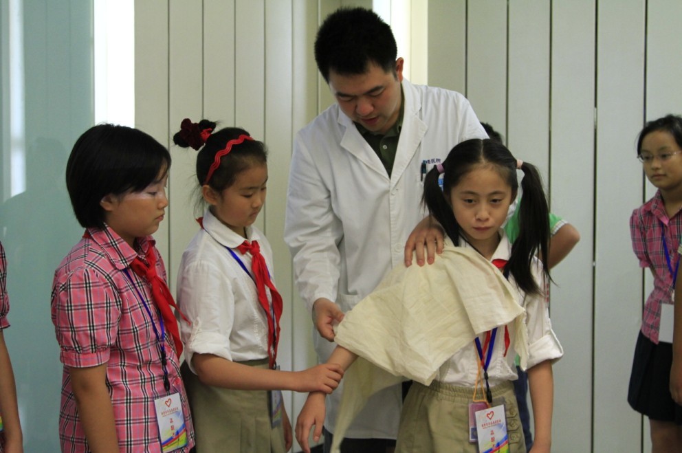 两天的活动都是以鼓楼医院急诊中心徐鹏医生的急救知识讲座拉开序幕的,徐鹏医生将心肺复苏、外伤包扎等生活中常见的医疗突发情况的辨识、应对措施讲解得生动易懂。在徐鹏医生的指导下,小志愿们者还开展了“实战演练”:大家轮番上台尝试为扮演病患的同学进行三角巾包扎,在模拟人身上进行心肺复苏模拟练习等。一名参加活动的小志愿者表示,以前只是在电视上见过心肺复苏模拟人,这次终于实际去体验了一下,发现并不是电视里那样简单,几次按压后自己的手掌都红了,医疗志愿者们真的不简单。