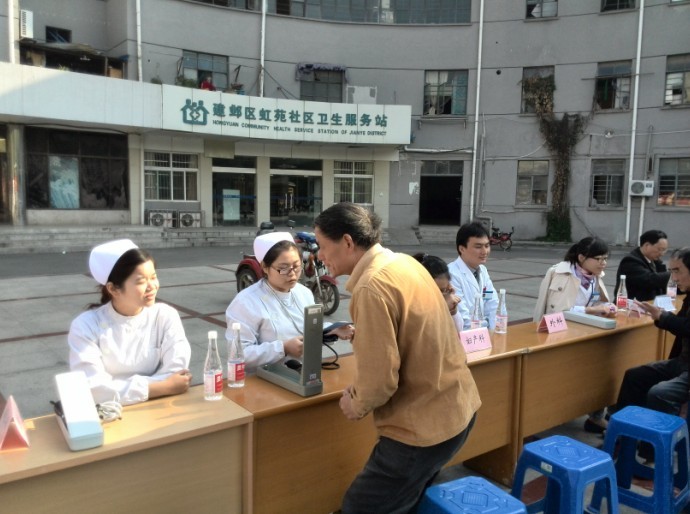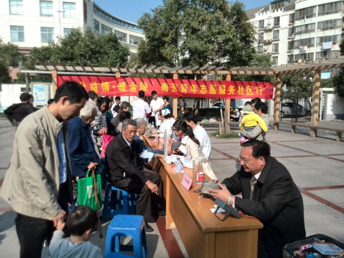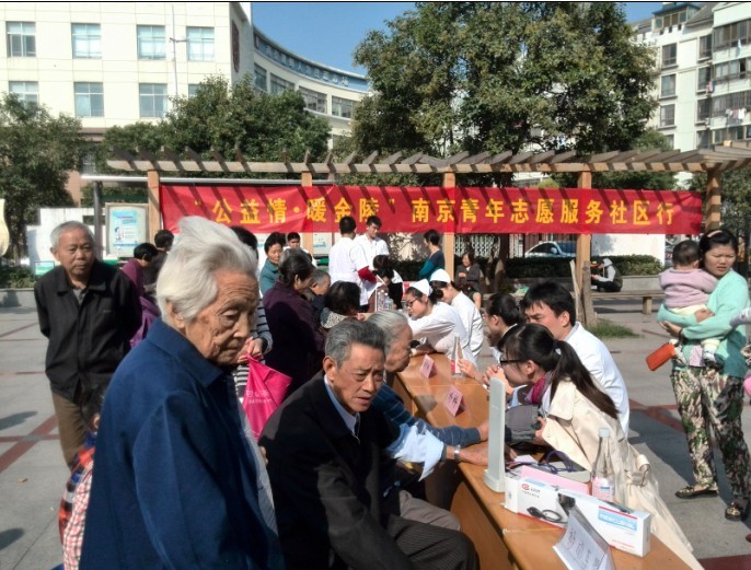 2013年10月27日上午, 由鼓楼医院、儿童医院、胸科医院青年志愿者服务队组成的“南京鼓楼医院集团青年志愿者联盟”结合各自医院的优势特点,精心组织了青年医护志愿者到建邺区虹苑新寓进行义诊服务。