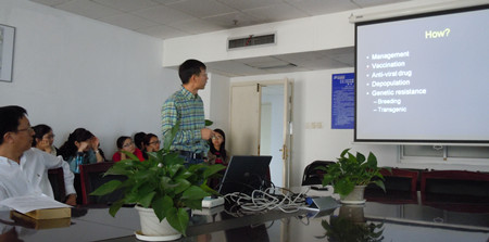 讲学,作了“关于宿主对流感病毒感染的全身系统抵抗的生理分析”报告。周怀军博士为PLos One等知名杂志编委,在动物模式研究和分子生物学等领域有较深造诣。