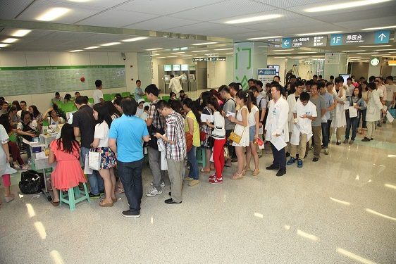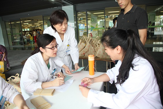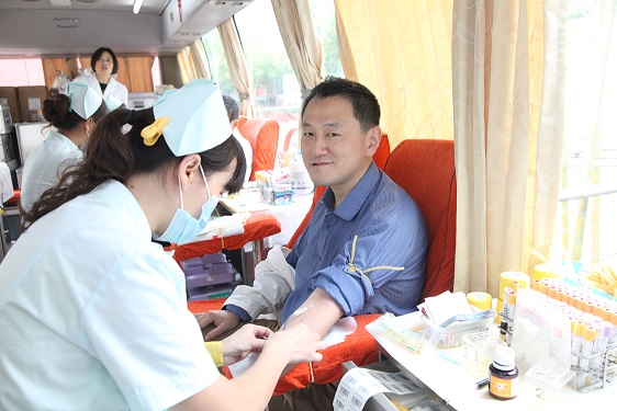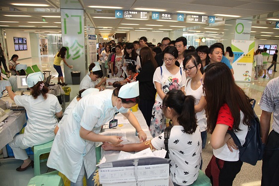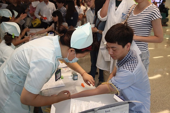 为了保障青奥期间正常的医疗工作,缓解血源紧张的现状,8月19日上午,鼓楼医院红会组织“白衣仁术治伤病 天使献血救生命”医务人员无偿献血活动。上午7:30,院红会领导韦宁华、吴建中、各分会主席及相关职能处室负责人均到场组织协调。8点钟不到,红会的两台采血车前就自发排起了长龙。献血队伍中有刚下了夜班的护士,有今年8月初刚进医院的新员工,有刚查完房早饭都没来得及吃的外科主任,有从当兵时期起就坚持每年献血两次的“献血明星”,有一心想加入稀有血型血库的“熊猫血”护士,还有妇科护士长从外地回宁休假的儿子……