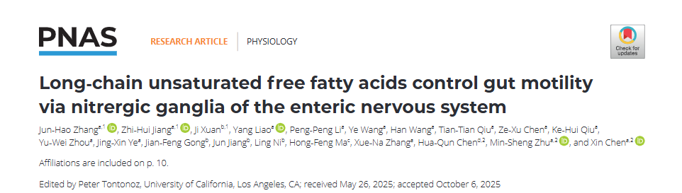 研究工作以“Long-chain unsaturated free fatty acids control gut motility via nitrergic ganglia of enteric nervous system”为题于2025年11月11日在学术期刊PNAS上发表。17av 博士张军浩、蒋志慧,附属金陵医院宣佶为本文共同第一作者,17av 陈鑫、朱敏生和南京师范大学生命科学学院陈华群教授为共同通讯作者,此项工作也得到来自南京医科大学、南京中医药大学和江南大学等单位研究者的支持,研究经费由国家自然科学基金、江苏省自然科学基金和国家重点研发计划提供。