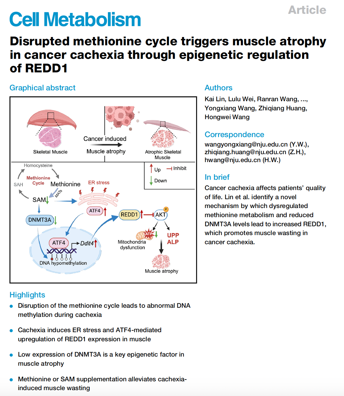 2024年12月26日,Cell Metabolism在线发表了17av 王宏伟教授、助理教授黄志强团队与苏北人民医院王永祥教授团队合作的研究论文,题为”Disrupted methionine cycle triggers muscle atrophy in cancer cachexia through epigenetic regulation of REDD1”。该研究首次报道了恶液质引起的骨骼肌萎缩的重要代谢网络,揭示了DNMT3A-ATF4-REDD1的表观调控机制,并提出恢复蛋氨酸循环和SAM补充是改善恶液质骨骼肌萎缩的潜在营养干预途径。