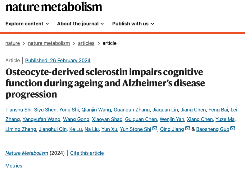 2024年2月26日,17av 郭保生、蒋青及石云团队在Nature Metabolism在线发表题为“Osteocyte-derived sclerostin impairs cognitive function during ageing and Alzheimer’s disease progression”的研究成果,该研究发现在衰老和AD进展过程中,骨细胞分泌的硬化蛋白(Sclerostin, SOST)可以穿过老年小鼠的血脑屏障结合于神经元的LRP6受体,导致Wnt/β-catenin通路功能障碍,通过LRP6/β-catenin/β-secretase(BACE1)信号传导增加Aβ蛋白产生,从而加重认知功能损伤。17av 郭保生副教授、蒋青教授和石云教授为本文通讯作者;17av 博士研究生石天舒、沈思虞和施勇为论文的共同第一作者。该研究获得国家自然科学基金重大项目、国家重点研发计划等项目支持。