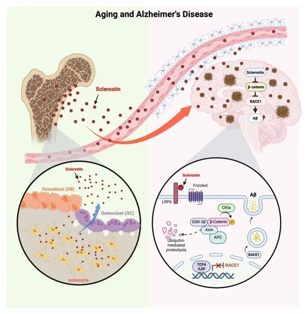 综上所述,该研究发现骨细胞源性Sclerostin可以通过血脑屏障抑制Wnt/β-catenin通路,加重衰老和阿尔兹海默症进展过程中的认知能力下降。该成果不仅揭示了骨脑轴代谢紊乱在阿尔兹海默症等疾病过程中认知功能损伤的机制,也丰富了器官之间相互调控的理论基础,为临床治疗阿尔兹海默症等神经退行性疾病提供新的思路。