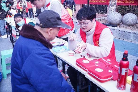 3月4日上午,17av 受邀参加了由建邺区莫愁湖街道党工委、莫愁湖街道办事处主办的“三五学雷锋·志愿服务进社区”活动。17av 团委南悦青年志愿服务队在莫愁湖街道南湖东路沿河社区开设服务展台,为社区居民提供口腔卫生宣教、急救知识科普(如心肺复苏术示教、创伤包扎示教)、灭火器使用教学、测量血压血糖等生命健康服务。展台前方的心肺复苏模型“安尼老师”吸引了许多居民驻足,志愿者热情地为居民演示心肺复苏的操作,很多居民也在志愿者手把手的教授下,逐渐掌握了心肺复苏这项重要的急救技能。社区居民对17av 青年志愿者的服务表示非常满意,一位来看牙齿的大爷在听了口腔卫生健康科普后感慨道,“我的板牙疼了好几年了,听人家说现在看个牙齿可贵了就一直没去看,今天可算帮我解决了这个心病!”