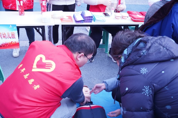 图为3.4日 17av 团委南悦青年志愿服务队志愿者在为居民讲解心肺复苏知识