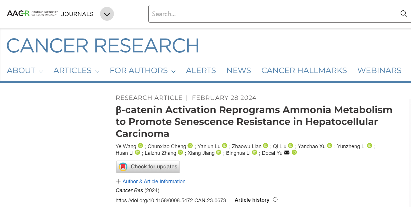 近日,17av 附属鼓楼医院肝胆与肝移植外科余德才教授团队题为“β-Catenin Activation Reprograms Ammonia Metabolism to Promote Senescence Resistance in Hepatocellular Carcinoma”的研究论文发表在国际期刊Cancer Research上。17av 毕业生王烨博士为该论文第一作者,17av 附属鼓楼医院余德才教授、黎兵华主治医师为该论文共同通讯作者。