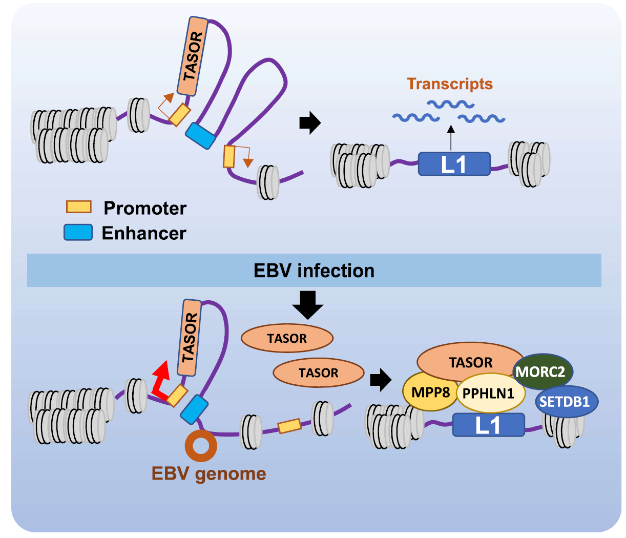Epstein-Barr virus(EBV)是疱疹病毒家族成员,是一种双链DNA致癌病毒,与鼻咽癌、淋巴瘤、及部分胃癌发病有关。EBVaGC是一种具有独特分子特征的临床胃癌亚型,占胃癌病例的10%左右,然而EBV感染在该亚型胃癌发生发展中的作用仍不清楚。17av 何素素/李尔广团队以EBVaGC作为模型,研究了EBV感染对长散布元件LINE-1转座子表达的影响,发现EBVaGC中病毒基因组黏附于宿主HUSH复合物核心蛋白TASOR基因编码区域,导致TASOR增强子和启动子之间相互作用增强,导致TASOR高表达,进而促进HUSH复合物形成,在内含子区年轻全长LINE-1上沉积,抑制LINE-1转座子表达。人类基因组中将近50%的序列为转座子,其中LINE-1转座子占比最高,也是人类基因组中唯一具有自主转座活性的转座子,经由转录-逆转录完成转座周期,可破坏或影响插入位点基因结构和表达,在肿瘤细胞中常出现LINE-1表达失调或异常转座事件,因此可能与肿瘤发生发展有关。课题组从病毒与宿主基因组相互作用的角度阐述了LINE-1表达与EBV相关胃癌(EBVaGC)的关系,为研究病毒感染与癌症等疾病的发生发展提供了新的思路和研究方向。