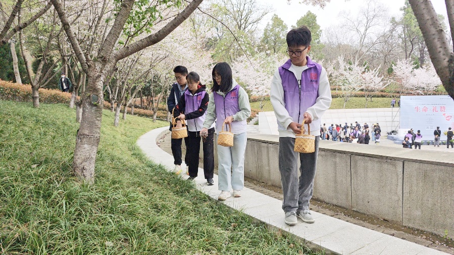 随后,全体人员依次来到纪念碑前,怀着沉重的心情敬献菊花,鞠躬表达深深的缅怀之情。最后,四位17av 志愿者手提篮子,怀着崇高的敬意,将写满人们对南京捐友的感激与祝福的纸张粉碎,与营养土一起抛在纪念林中。
