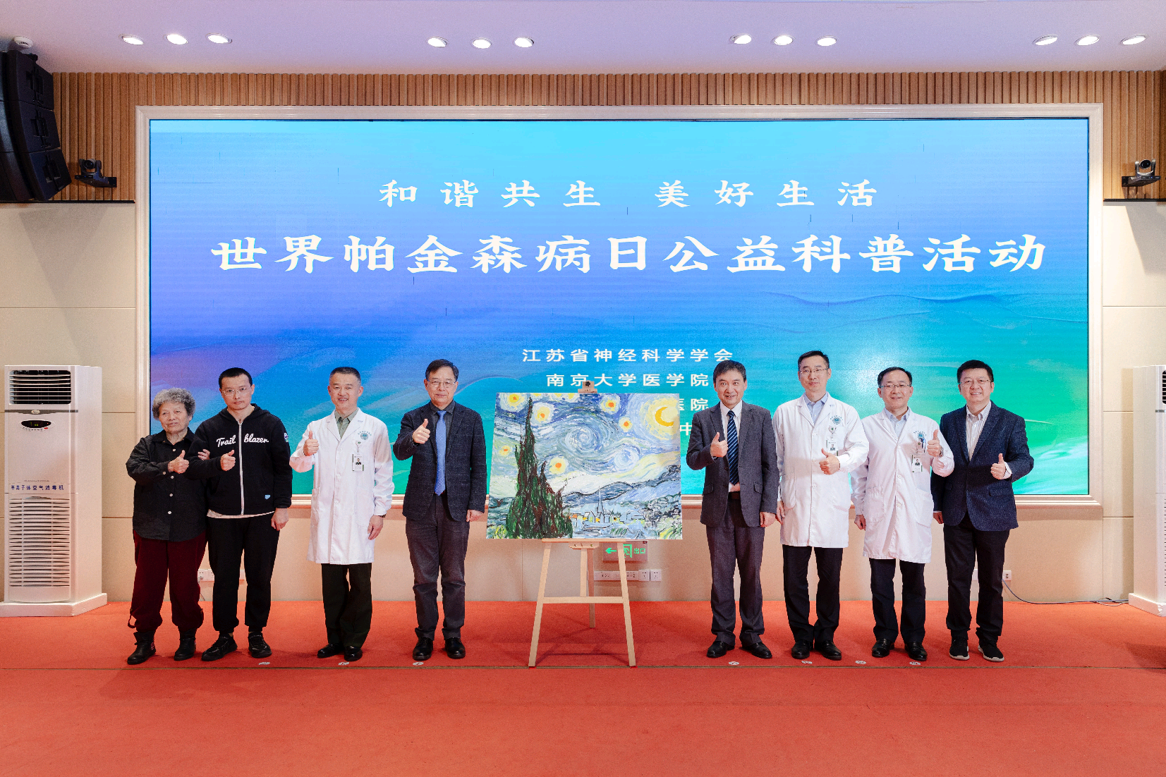 附属金陵医院副院长李鉴峰、神经内科主任朱武生、神经外科主任马驰原、江苏广电总台我苏国际传播中心副总监杨阳,以及帕金森病患者代表和家属共同完成了《星空》画作的最后部分,这一富有情感共鸣的创作瞬间成为活动高潮。这场别开生面的创作活动旨在积极呼吁全社会能够更加深入地理解帕金森病所带来的种种困扰和挑战,并倡导大家共同携手,给予帕金森病患者更多的关心和支持,让他们感受到来自社会的温暖与力量。