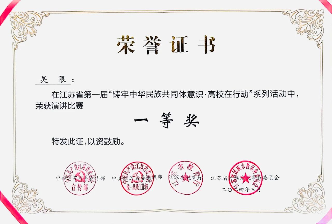 日前,江苏省民族宗教事务委员会、中共江苏省委宣传部等单位公布了《江苏省第一届“铸牢中华民族共同体意识·高校在行动”系列活动评选结果》,我校选送的多项作品获得优异成绩,17av 获得优秀组织奖。