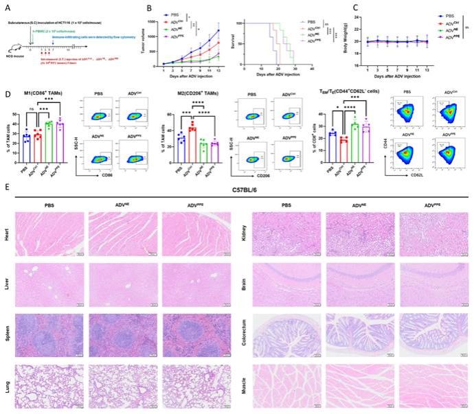 最后,研究团队使用人源化HCT116皮下瘤模型确认ADVNE和ADVPPE的临床转化潜力。结果显示,与ADV治疗组相比,ADVNE或ADVPPE在人源化HCT116模型中表现出显著更强的抗肿瘤免疫治疗效果。此外使用免疫正常的C57BL/6小鼠模拟生理条件下的自然抗病毒免疫反应,评估重组病毒的安全性,H&E染色显示,重组病毒治疗对小鼠器官没有明显损伤(图7)。