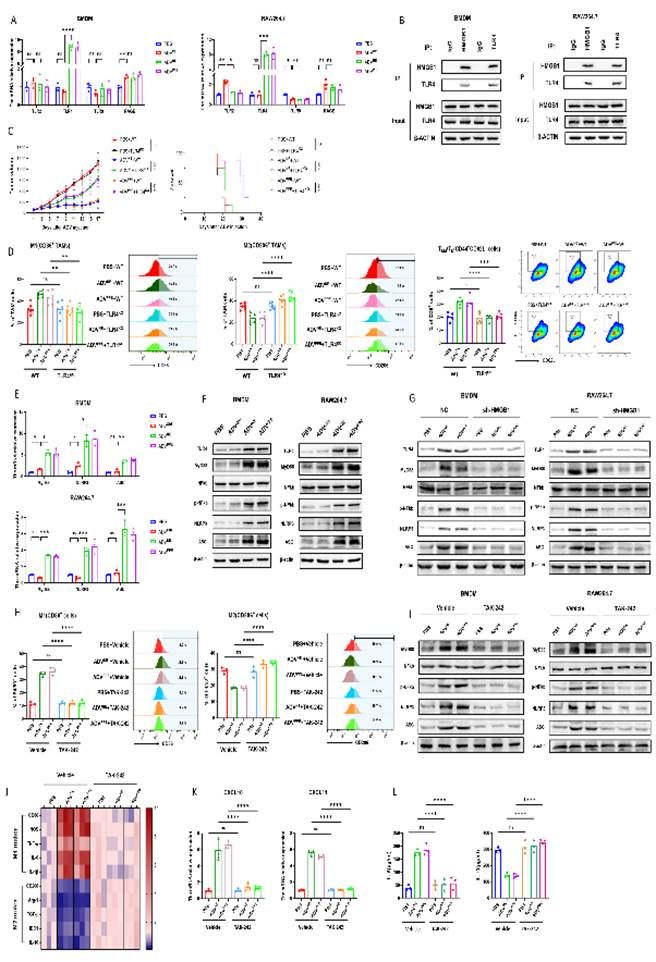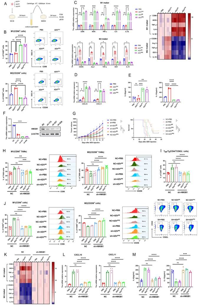 紧接着,团队借助体外细胞培养证明,重组病毒处理的肿瘤细胞培养基显著促进了骨髓来源的巨噬细胞(BMDMs)的M1极化,抑制了M2极化。有报告表明,HMGB1可以诱导巨噬细胞M1极化。本研究观察到重组腺病毒处理的结直肠癌细胞释放到培养基中的HMGB1显著增加,而HMGB1缺陷的肿瘤细胞的培养基无法诱导BMDMs的M1极化。这进一步揭示了ADVNE和ADVPPE表达的NE或PPE诱导肿瘤细胞释放HMGB1,导致了肿瘤微环境中巨噬细胞的M1极化(图5)。
