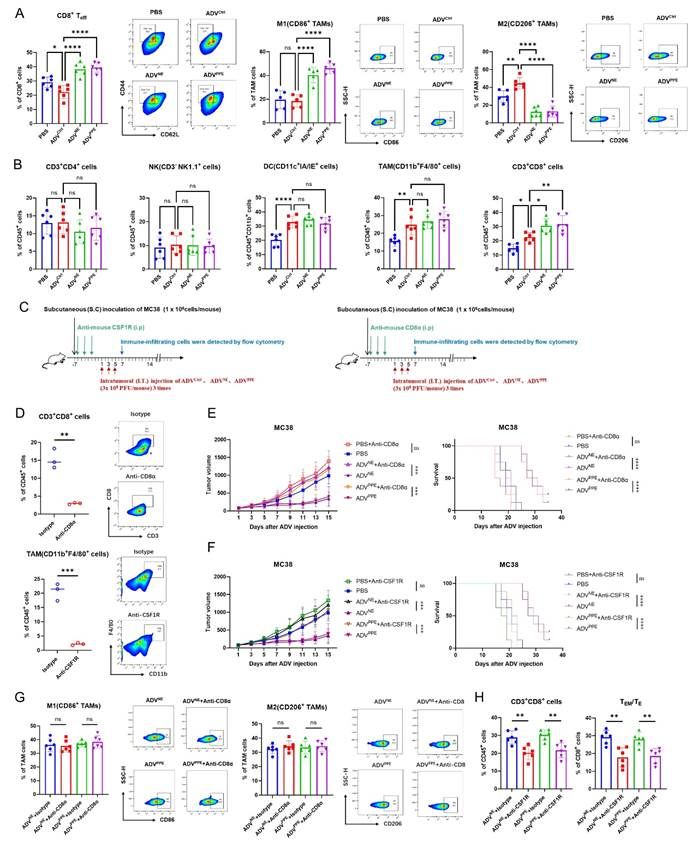 这项研究首先利用MC38和CT26小鼠皮下肿瘤模型评估了ADV的治疗效果,证明了ADV显著抑制肿瘤生长,并延长小鼠生存时间,但是流式细胞术分析显示,ADV治疗引发肿瘤负免疫反馈,表现为效应记忆/效应CD8+T细胞(TEM/TE)浸润显著减少和M2巨噬细胞浸润增加(图1)。