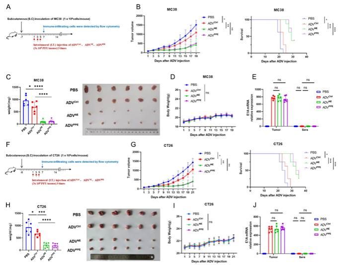 图3 重组溶瘤腺病毒 ADVNE 和 ADVPPE 在结直肠癌小鼠模型中的抗肿瘤作用