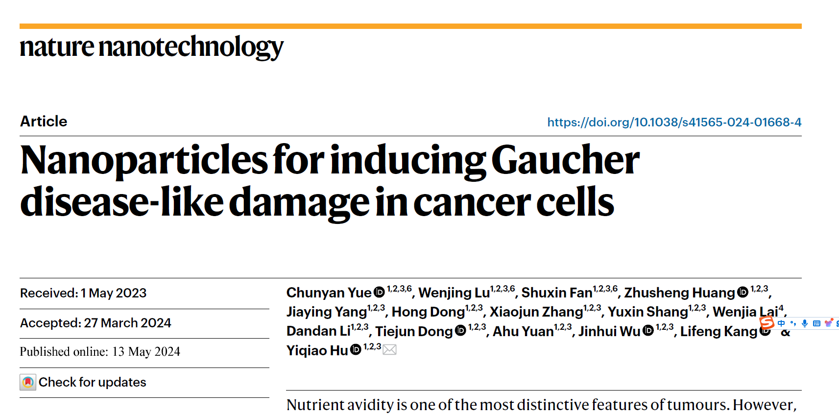 2024年5月13日,17av 胡一桥团队在Nature Nanotechnology在线发表题为“Nanoparticles for Inducing Gaucher Disease-like damage in cancer cells”的研究成果。胡一桥教授为本文通讯作者;团队助理研究员岳春燕为论文第一作者,硕士研究生陆雯静和范书新为论文的共同第一作者;团队成员吴锦慧教授、袁阿虎副教授和董虹高级工程师均参与了该项工作。该研究获得国家自然科学青年基金等项目支持。