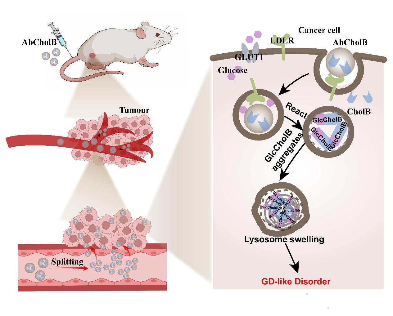 胆固醇是一种肿瘤细胞最喜欢的脂类营养物质,研究团队将一种含硼的胆固醇(CholB),与白蛋白非共价结合后,形成LDL样纳米粒(AbCholB)。利用肿瘤细胞对脂类营养的强争夺性,该纳米粒经表面LDL受体被主动摄入到肿瘤细胞内。进入细胞后,释放出的CholB可以通过硼酸基团与葡萄糖结合,产生类似GD细胞的糖苷化产物。这些糖苷化产物不断聚集,在溶酶体内形成微米级的结晶,导致溶酶体溶胀,产生类似GD的代谢障碍。而且,肿瘤恶性程度越高,对糖脂的需求越高,摄入的CholB和葡萄糖就越多,糖苷化产物聚集情况就越严重,造成的损伤也就越大。相反,正常细胞对糖脂的争夺能力较弱,受损很小。