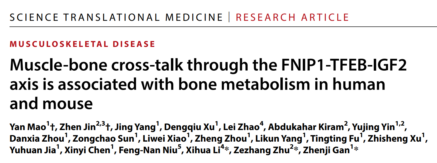2024年6月5日,17av 甘振继教授课题组联合17av 附属鼓楼医院朱泽章教授课题组和复旦大学附属儿科医院李西华教授课题组在Science Translational Medicine长文发表了题为“ Muscle-bone cross-talk through the FNIP1-TFEB-IGF2 axis is associated with bone metabolism in human and mouse”的研究成果。此项工作发现了肌-骨对话轴调节肌源性骨病发病新机制,这一肌-骨信号轴可能成为治疗肌肉疾病和骨质疏松症的潜在靶点。17av 博士研究生毛岩,南京医科大学博士研究生靳祯为本文的共同第一作者。17av 甘振继教授,17av 附属鼓楼医院朱泽章教授和复旦大学附属儿科医院李西华教授为本文的共同通讯作者。该项研究得到了国家自然科学基金委、科技部、教育部、江苏省科技厅以及中央高校等基金的支持,并在相关研究方面得到合作实验室的大力协助与支持。