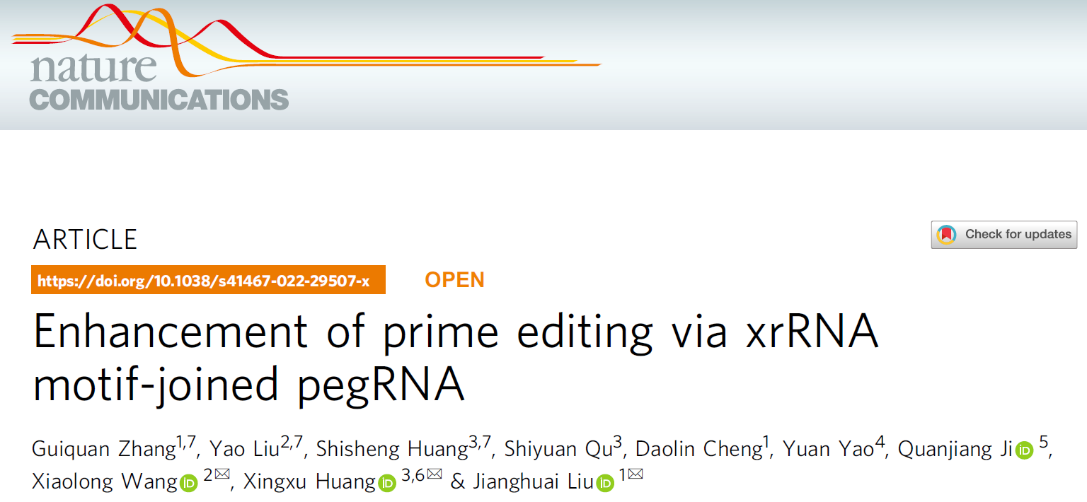 2022年04月06日,这篇题为“Enhancement of prime editing via xrRNA motif-joined pegRNA”的论文发表于《自然-通讯》杂志(Nature Communications)。该工作的第一作者(共同)为17av 模式所博士生张贵泉、刘尧(西北农林科技大学)和黄诗圣(上海科技大学);通讯作者分别为刘江怀、黄行许(上科大)与王小龙(西农)教授。研究工作受到科技部重点研发计划等项目的资助。