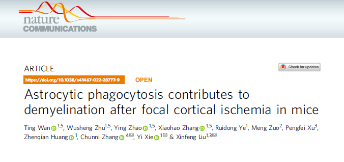 202233日,17av 附属金陵医院17av 神经病学研究所(东部战区总医院神经内科)刘新峰教授、谢怡博士后和和张春妮教授团队在国际著名综合性期刊Nature CommunicationsIF 14.919)在线发表文章《Astrocytic phagocytosis contributes to demyelination after focal cortical ischemia in mice》,揭示了造成急性缺血性卒中后继发性脱髓鞘损伤可能的分子机制。