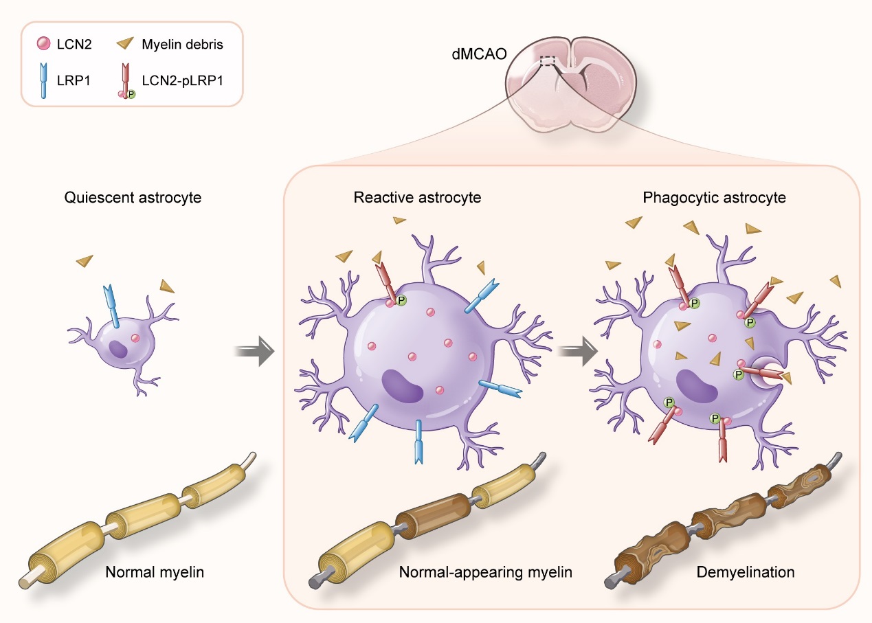研究团队采用左侧远端大脑中动脉永久闭塞的模型造成小鼠左侧大脑皮质局部缺血性梗死,取非缺血区胼胝体研究星形胶质细胞表达的LCN2在继发性胼胝体损伤中的关键作用。研究结果表明,野生型小鼠胼胝体确有严重脱髓鞘改变,该部位星形胶质细胞高表达LCN2,且LCN2阳性的星形胶质细胞具有吞噬髓鞘碎片的功能。而Lcn2-/-小鼠的星形胶质细胞吞噬功能受限,脱髓鞘损伤也较轻。本研究还使用慢病毒转染的方法使Lcn2-/-小鼠胼胝体区星形胶质细胞特异性表达非分泌型LCN2Δ2-20),通过对星形胶质细胞吞噬功能和胼胝体脱髓鞘损伤严重程度的分析,进一步确定了胞内LCN2在继发性脱髓鞘病变中的重要地位。为了解析可能的下游分子机制,本研究通过免疫共沉淀的方法确认造模后LCN2和介导细胞吞噬作用的受体LRP1结合增加,导致LRP1磷酸化,激活下游吞噬活化相关通路,从而调控星形胶质细胞的吞噬功能。而用LV-Lrp1-RNAi的方法抑制LRP1表达可以减轻LCN2诱导的星形胶质细胞对髓鞘碎片的吞噬功能,并延缓胼胝体脱髓鞘进程。因此,本研究证明内源性LCN2可以通过与LRP1结合激活吞噬信号通路促进星形胶质细胞吞噬髓鞘碎片的能力,最终造成缺血后继发性胼胝体脱髓鞘病变(图一)。
