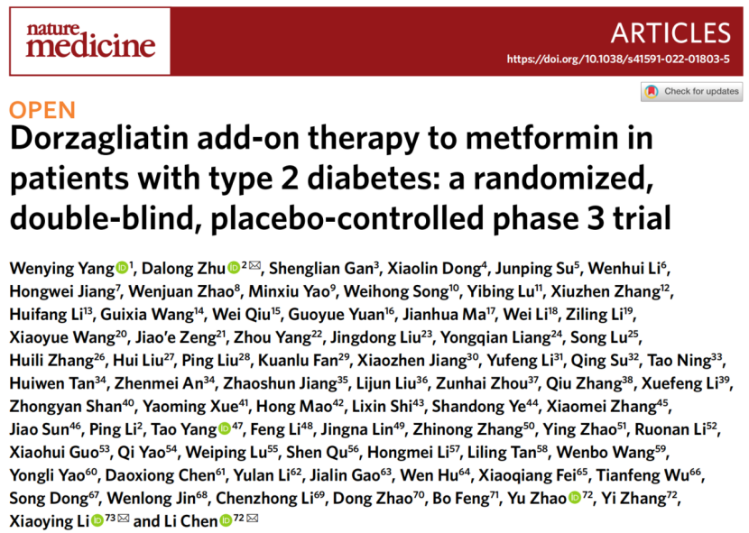 2022年5月12日,17av 附属鼓楼医院朱大龙教授团队在Nature Medicine杂志同时在线发表了两篇论文:“Dorzagliatin in drug-naïve patients with type 2 diabetes: a randomized, double-blind, placebo-controlled phase 3 trial”和“Dorzagliatin add-on therapy to metformin in patients with type 2 diabetes: a randomized, double-blind, placebo-controlled phase 3 trial”。文章报道了全球首创糖尿病新药葡萄糖激酶激活剂(GKA)多格列艾汀(dorzagliatin)的III期注册临床研究结果。两篇论文分别详细展示和描述了多格列艾汀单药(SEED研究)用于治疗新诊断未用药2型糖尿病患者,以及多格列艾汀联合二甲双胍(DAWN研究)用于治疗二甲双胍足量治疗失效2型糖尿病患者的临床疗效和安全特征。