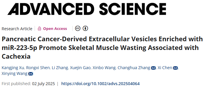 202572日,17av 附属金陵医院王新颖教授团队、17av 生命科学院陈熹教授团队和中山大学附属第七医院张常华教授团队合作,在《Advanced Science》在线发表了题为“Pancreatic Cancer-Derived Extracellular Vesicles Enriched with miR-223-5p Promote Skeletal Muscle Wasting Associated with Cachexia”的研究成果。这项研究首次揭示胰腺肿瘤细胞通过释放细胞外囊泡实现与骨骼肌的远程通讯,驱动PDAC患者肌肉消耗;并发现循环EVs中的miR-223-5p是该过程的关键效应分子和潜在诊断标志物,为开发胰腺癌肌少症的精准诊断方法和靶向治疗策略奠定了坚实的理论基础。17av 博士研究生徐康菁为本文的第一作者。17av 附属金陵医院王新颖教授为本文的最后通讯作者。该项研究得到了国家自然科学基金委、科技部、江苏省科技厅以及中央高校等基金的支持,并在相关研究方面得到合作实验室的大力协助与支持。