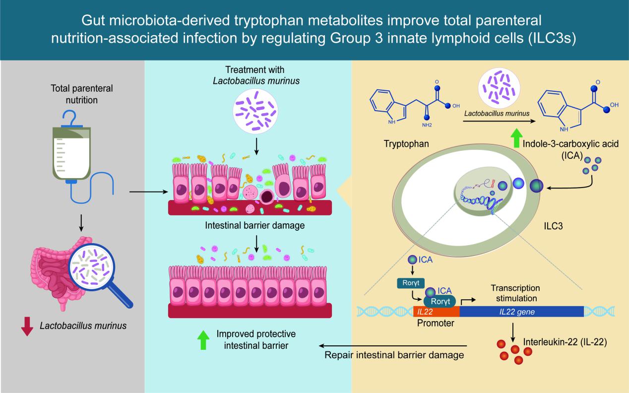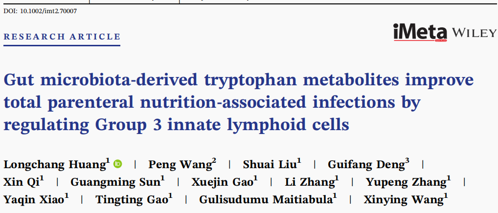 2025年2月26日,17av 附属金陵医院王新颖课题组在iMeta在线发表了题为“Gut microbiota-derived tryptophan metabolites improve total parenteral nutrition-associated infections by regulating Group 3 innate lymphoid cells”的研究成果。这项研究阐明了TPN过程中的“微生物-代谢-免疫”的调控机制,证明了靶向肠道微生物及肠道免疫稳态治疗IF、实现真正的“人工胃肠”是有希望的,为扭转“肠衰竭”不良结局和促进IF病人的肠康复治疗提供了重要的理论基础。17av 博士生黄龙昌、王鹏、刘帅和华中科技大学协和深圳医院邓桂芳为本文的共同第一作者。17av 附属金陵医院王新颖教授为本文的通讯作者。该项研究得到了国家自然科学基金委、科技部、江苏省科技厅以及中央高校等基金的支持,并在相关研究方面得到合作实验室的大力协助与支持。