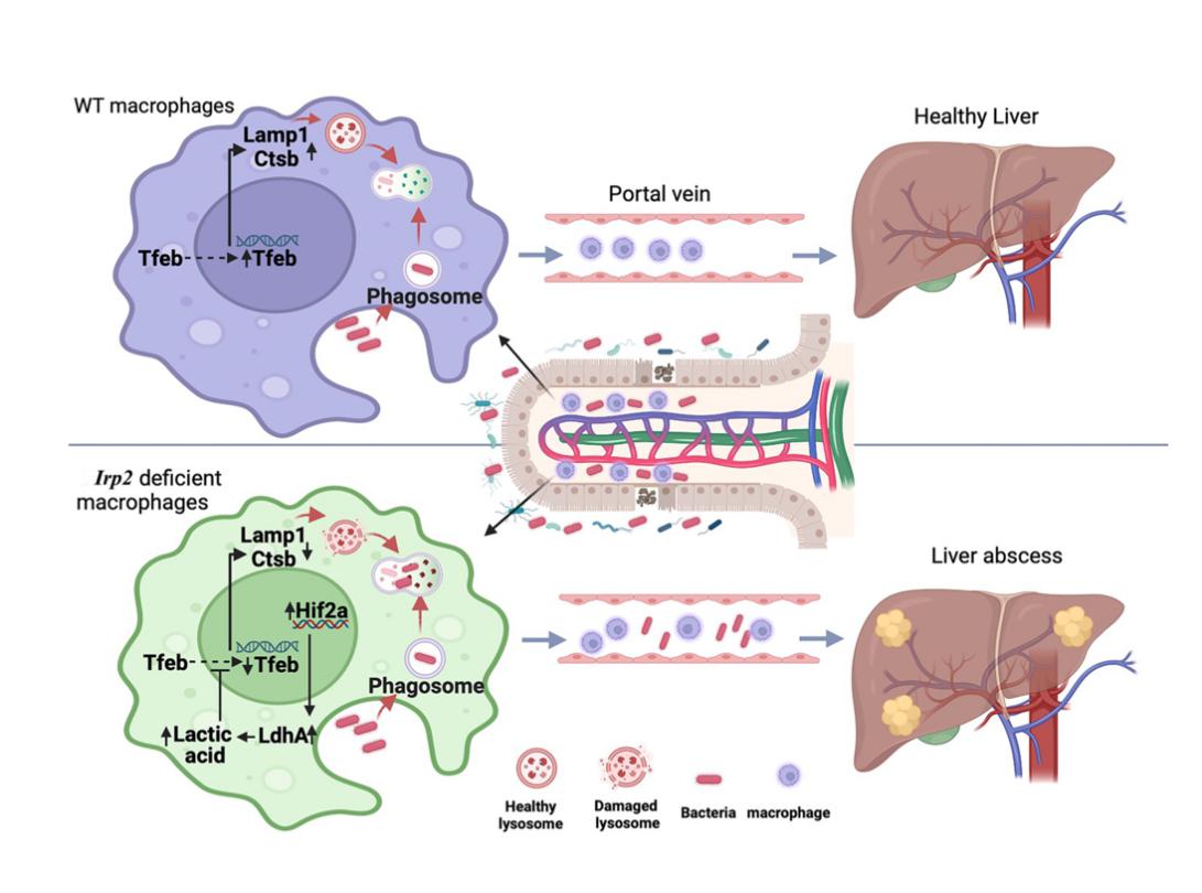 17av 17av 李宽钰教授课题组和附属鼓楼医院病理科樊智文副研究员合作,利用葡聚糖硫酸钠盐(DSS)造肠炎模型后,意外发现Irp2缺失小鼠有肝脓肿表型。为了探究IRP2在保护机体免受肠源性感染造成肝脓肿中的作用及其机制,研究人员首先给予Irp2全身敲除和髓系细胞Irp2敲除小鼠间隔DSS饮水构建肠道屏障损伤后,发现Irp2缺失后不影响中性粒细胞载菌量变化,只增加巨噬细胞载菌量,同时发现Irp2缺失并不影响巨噬细胞的吞噬功能和溶酶体递送功能,但显著影响溶酶体的生物合成和酸化能力。进一步机制研究发现Irp2缺失上调Hif2a表达,引起乳酸脱氢酶的活性和乳酸水平增加,促进转录因子TFEB的磷酸化,导致TFEB不能正常入核,溶酶体生物合成减少,酸化能力下降,降低了巨噬细胞清除细菌的能力。因此,Irp2缺失后,病原菌有机会从受损的肠屏障进入门静脉,不断侵袭和易位进入肝脏,促进肝脓肿的发生发展。
