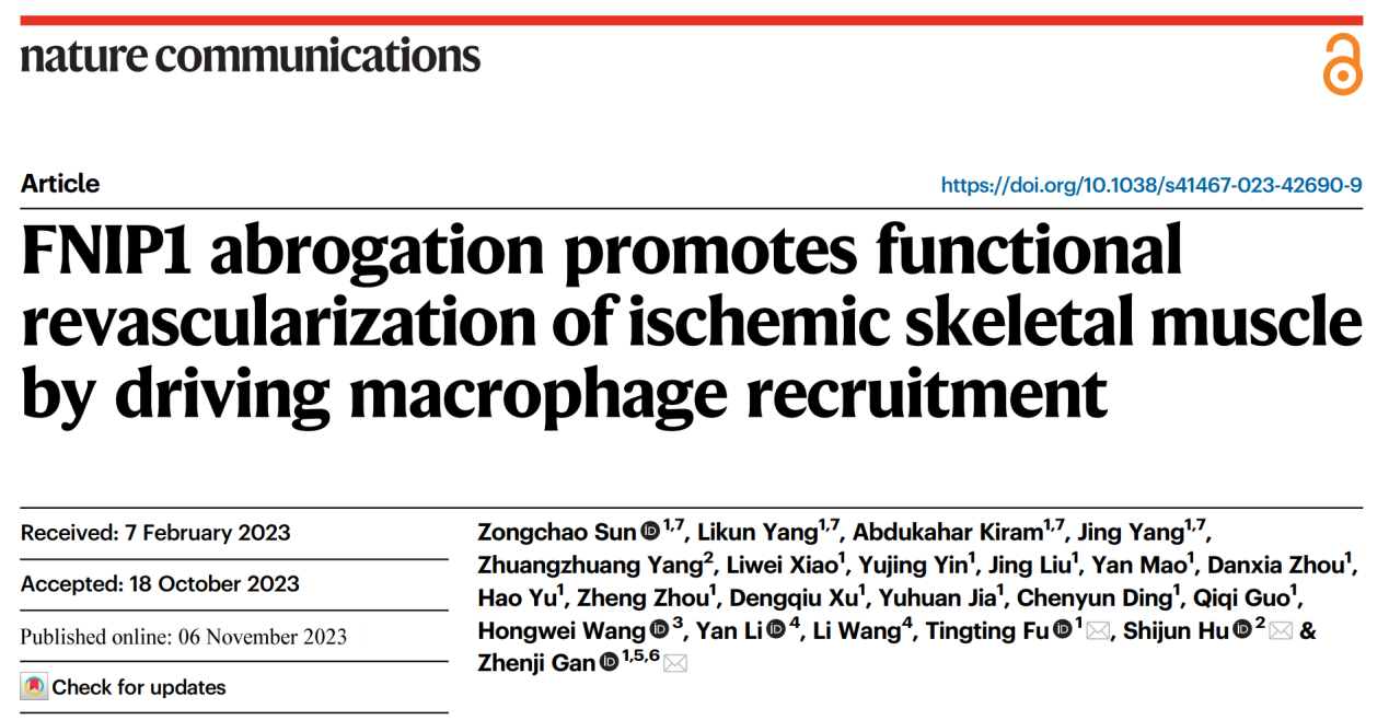 2023年11月6日,17av 甘振继教授课题组联合苏州大学胡士军教授课题组在Nature Communications长文发表了题为“FNIP1 abrogation promotes functional revascularization of ischemic skeletal muscle by driving macrophage recruitment”的研究成果。17av 博士研究生孙宗超、杨立坤、阿布都哈卡尔·克拉木、杨静为本文的共同第一作者。17av 甘振继教授、苏州大学胡士军教授及17av 付婷婷副研究员为本文的共同通讯作者。共同作者里还有17av 的王宏伟教授,江南大学的李言教授和王立教授等。研究得到合作实验室的大力协助与支持。上述研究得到了中国科学技术部、国家自然科学基金委、教育部、江苏省科技厅以及中央高校等基金的支持。
