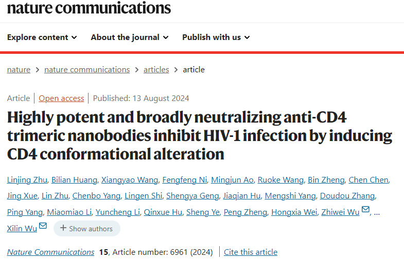 2024年8月13日,吴稚伟和吴喜林课题组在Nature Communications发表了题为“Highly potent and broadly neutralizing anti-CD4 trimeric nanobodies inhibit HIV-1 infection by inducing CD4 conformational alteration”的研究论文。该研究发现强调了抗CD4纳米抗体在HIV治疗中的高效且广谱的效果,对推进HIV的临床治疗具有重要意义。17av 吴稚伟教授和吴喜林助理教授、清华大学张林琦教授、天津大学王亚鑫副教授和中科院武汉病毒所刘雅兰副研究员为论文的共同通讯作者;17av 17av 博士生朱林静、黄碧莲为本文共同第一作者。同时特别感谢17av 化学化工学院郑鹏教授、南京市第二医院魏洪霞主任和中国医学科学院薛婧研究员等的大力支持。该研究得到了国家自然科学基金(No.32370988, 31970149 and U22A20335) 和江苏省自然科学基金重点项目(Grant# ZDA2020014),国家自然科学基金重点研发计划(2023YFC2306600),国家十三五传染病重大专项(2018ZX10301406)等项目的支持。