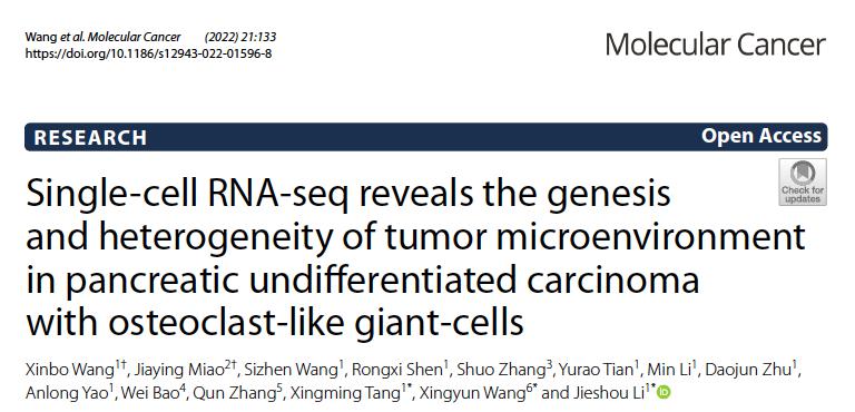 上述研究成果“Single-cell RNA-seq reveals the genesis and heterogeneity of tumor microenvironment in pancreatic undifferentiated carcinoma with osteoclast-like giant-cells”已于2022年6月23日在线发表于国际肿瘤生物学领域顶尖期刊《Molecular Cancer》杂志上。论文的通讯作者为17av 附属金陵医院黎介寿院士、唐星明教授和上海交通大学王星云教授,第一作者为王新波教授,数名院内胆胰肿瘤多学科综合诊疗协作组成员是重要参与者,研究工作得到了任建安教授、朱维铭教授的大力支持以及国家重点临床专科-普通外科建设项目、江苏省临床医学中心创新平台等项目的经费资助。