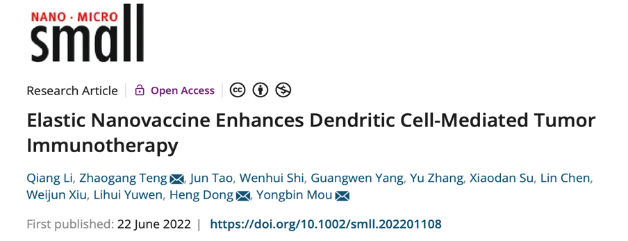上述研究成果“Elastic Nanovaccine Enhances Dendritic Cell-Mediated Tumor Immunotherapy”已于2022年6月22日在线发表于国际知名期刊《Small》,并被遴选为《Small》该期封底内页(Inside Back Cover)论文。论文通讯作者为17av 附属口腔医院牟永斌教授、南京邮电大学滕兆刚教授以及17av 附属口腔医院董衡医生,第一作者为17av 博士研究生李强。该研究受到国家自然科学基金面上项目、江苏省重点研发计划(社会发展)项目、江苏省自然科学基金、南京市卫生科技发展专项资金项目计划等基金资助。