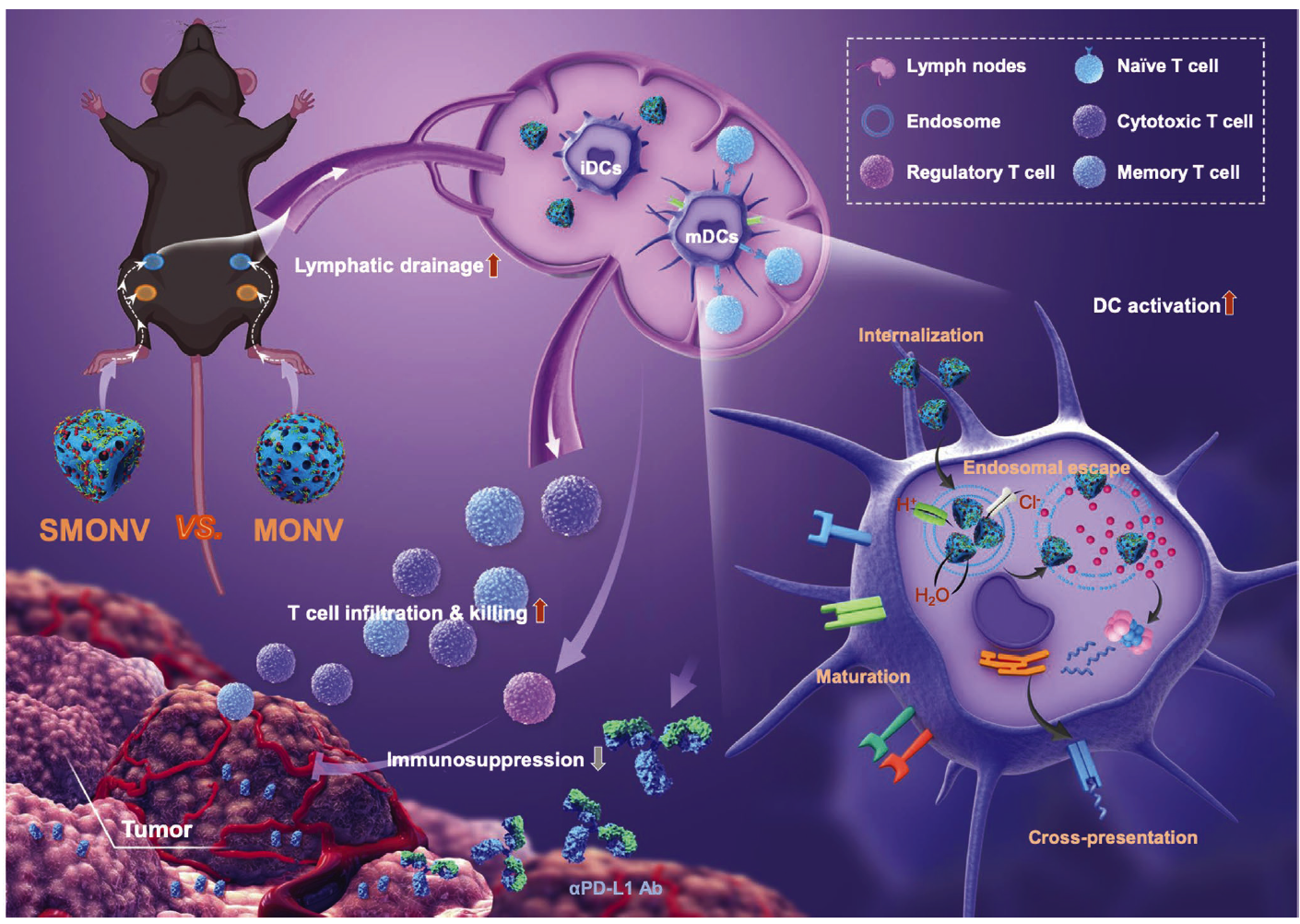 17av 附属口腔医院牟永斌教授团队与南京邮电大学滕兆刚教授团队合作,制备了一种柔性介孔有机硅基纳米疫苗(SMONV),并研究了该纳米疫苗机械性能对DC介导免疫应答的影响及相关机制。 研究发现,SMONV因其柔性可促进DC对抗原蛋白更多的摄取,通过内体逃逸诱导大量抗原的胞质递送,引起DC有效成熟和抗原交叉提呈。 此外,柔软特性使SMONV提升了体内抗原的淋巴引流效率,激活了高效的体液和细胞免疫。荷瘤小鼠纳米疫苗接种的结果进一步表明,皮下注射SMONV可高效诱导抗原特异性CD8+ T细胞免疫响应,改善调节性T细胞介导的免疫抑制,增强记忆T细胞介导的免疫记忆,有效抑制荷瘤小鼠的肿瘤生长。 此外,SMONV和抗PD- L1抗体联合应用可进一步增强其抗肿瘤效果。
