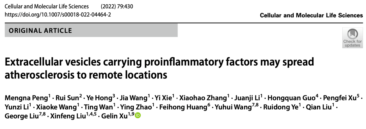 上述研究成果“Extracellular vesicles carrying proinflammatory factors may spread atherosclerosis to remote locations”于2022年7月18日在线发表于综合性期刊《Cellular and Molecular Life Sciences》。17av 彭蒙娜博士等为该研究论文的第一作者,徐格林教授、刘新峰教授为共同通讯作者。该研究与北京大学心血管研究所刘国庆教授、王宇辉副研究员合作完成。感谢国家自然科学基金对本研究的资助。