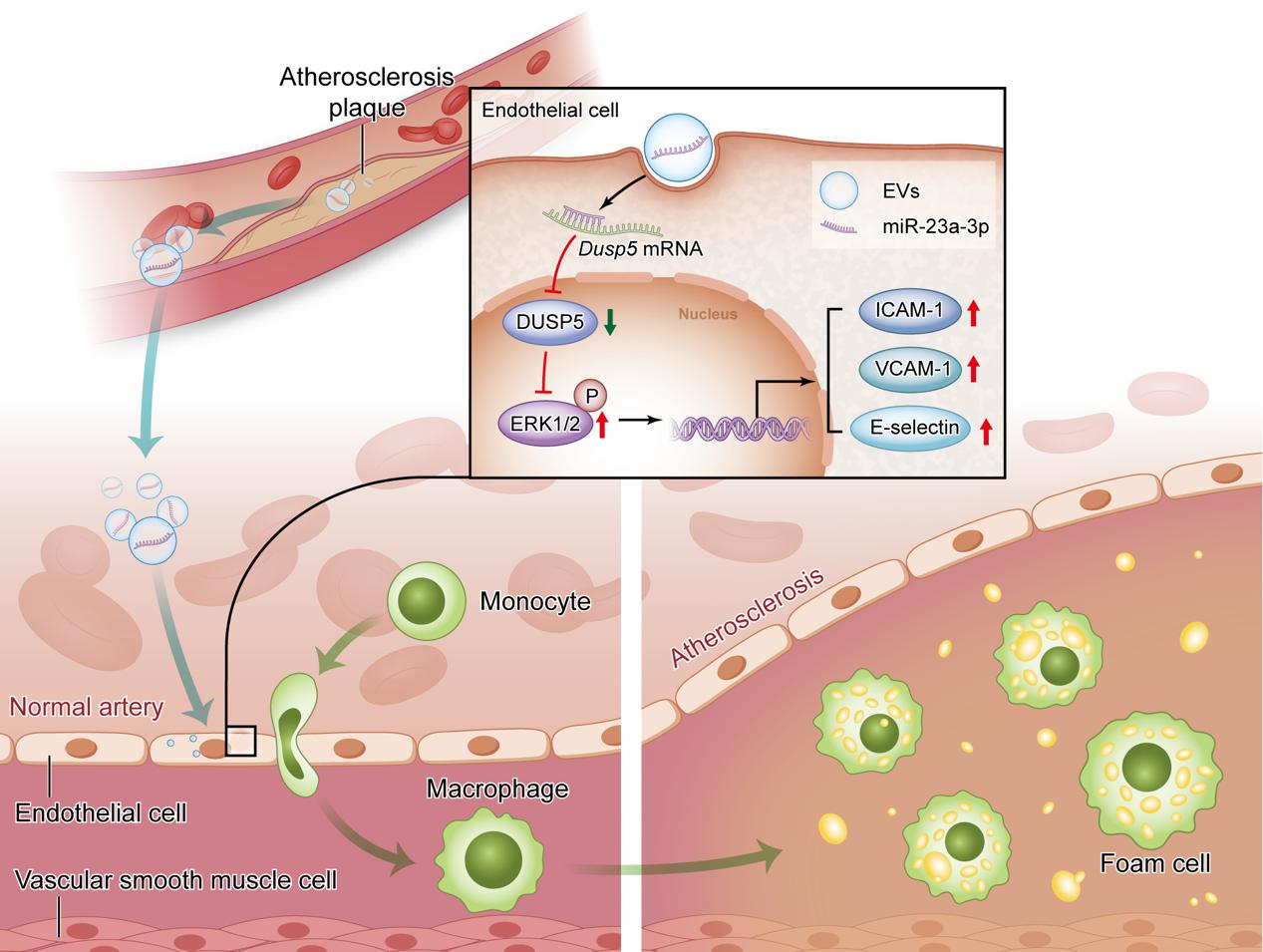 17av 附属金陵医院徐格林/刘新峰教授团队利用Ldlr KO大鼠建立颈动脉粥样硬化模型,提取动脉粥样硬化血管组织及流经颈动脉的血液中的外泌体,发现动脉粥样硬化来源的外泌体可以促进内皮细胞炎性反应。通过miRNA测序和q-PCR验证,发现miR-23a-3p高表达于动脉粥样硬化来源的外泌体中,并且能够分泌入血。体外实验证实miR-23a-3p可以通过靶向Dusp5 mRNA,激活MAPK通路,进而促进内皮细胞炎症。将动脉粥样硬化来源的外泌体打入大鼠循环中,可以观察到颈动脉内膜炎症反应上调,并且观察到颈动脉管壁增厚及管腔狭窄,抑制miR-23a-3p可以抑制外泌体介导的炎性反应及血管重构。该成果阐述了外泌体通过促进血管炎症反应,进而介导动脉粥样化硬化远隔部位转移的可能性,为动脉粥样硬化全身泛化的机制提供了新思路。