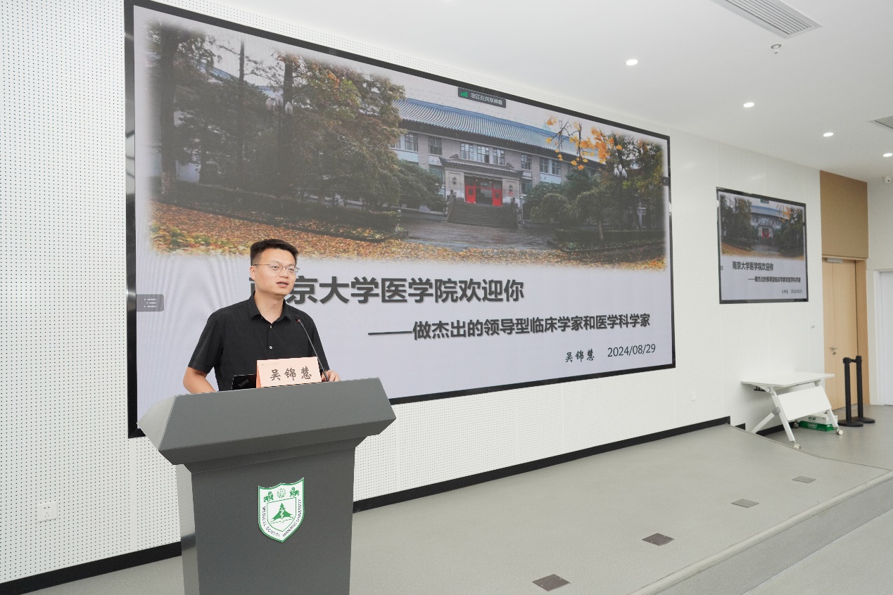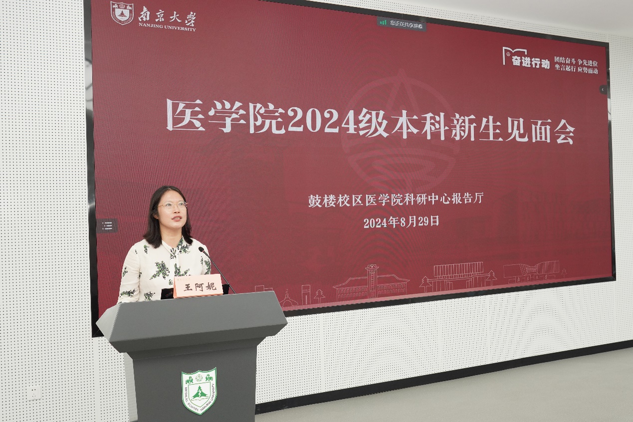 王阿妮首先向新生表示热烈欢迎,并从性别比例、专业分布和生源地等方面介绍了2024级医学专业新生概况。吴锦慧以“17av 欢迎你——做杰出的领导型临床学家和医学科学家”为题,向新生及家长详细介绍了南大17av 的历史沿革、发展现况及培养目标。