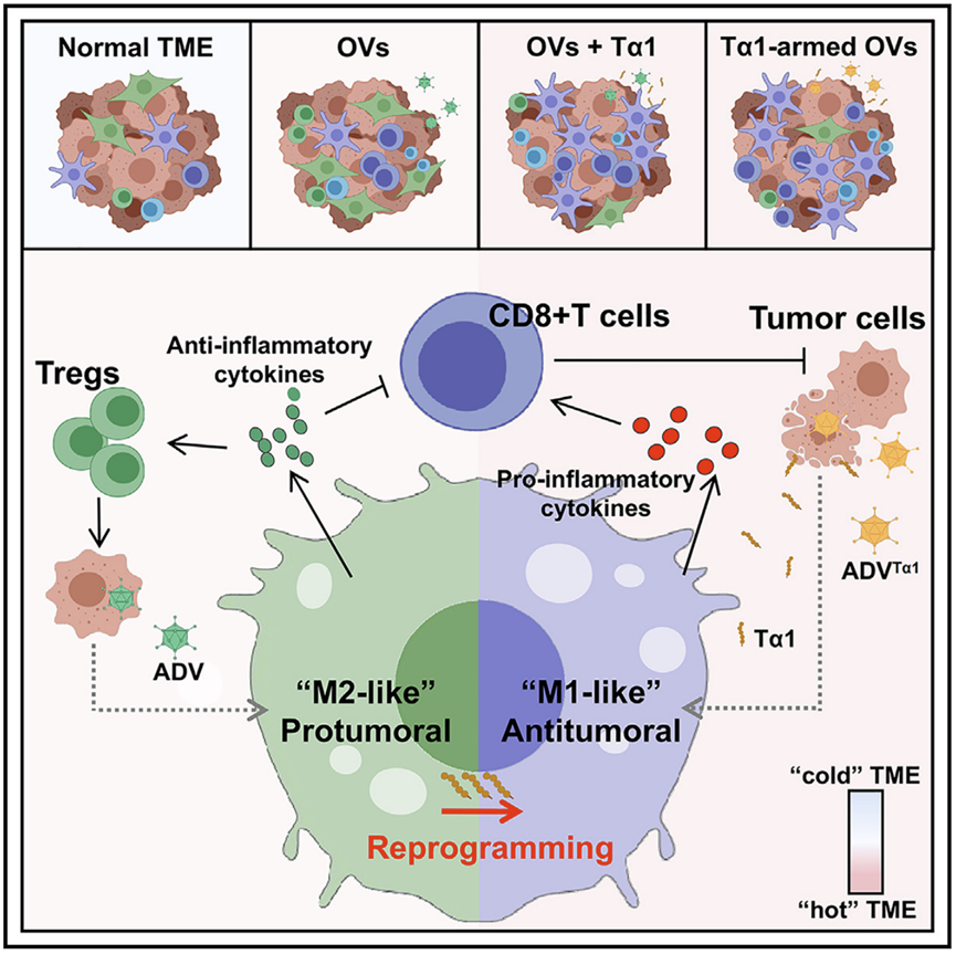 2024年10月15日,17av 吴俊华教授/江春平教授团队在Cell旗下的Cell Reports Medicine上发表了题为“Thymosin α1 reverses oncolytic adenovirus-induced M2 polarization of macrophages to improve antitumor immunity and therapeutic efficacy”的研究论文。17av 硕士毕业生刘跨等人为该研究论文的共同第一作者。17av 吴俊华教授和江春平教授等人为该论文的共同通讯作者。该研究得到了省实验室项目(编号SYS202202)、国家自然科学基金(编号81972888, 82272819)和省重点研发计划(编号BE2018701, BE2022840)等项目的资助。