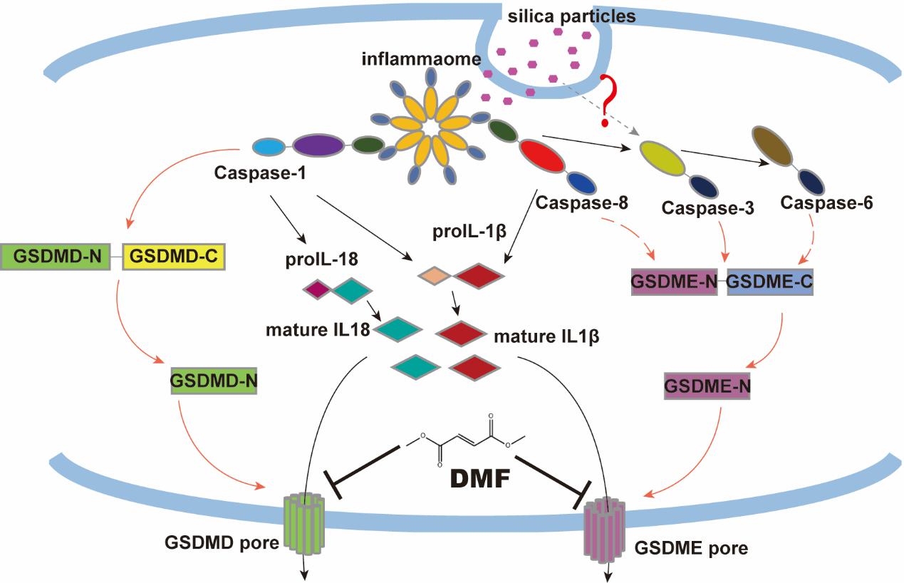 Since the related caspases not only mediate the cleavage of Gsdmd and Gsdme, but also mediate the maturation and release of cytokines. Inhibiting these caspases may be one of the ways to treat silicosis. The researchers designed in vivo experiments to study the therapeutic effect of caspase inhibitors on silicosis. Intraperitoneal injection of z-VAD-FMK or Caspase-1/-3/-8 inhibitors blocked the activation of pyroptotic markers and cytokines. DMF, an FDA-approved drug, inhibits the cleavage of GSDMD and GSDME. Finally, the researchers found that DMF also had a significant protective effect against silicosis in mice.