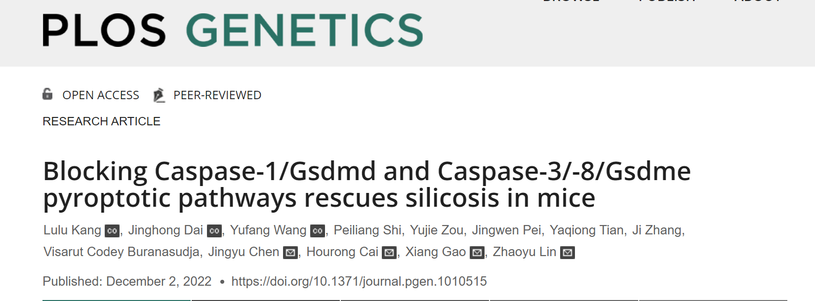 On December 2, 2022, Zhaoyu Lin and Xiang Gao’s research group from Model Animal Research Center, Nanjing University Medical School, Hourong Cai’s research group from Nanjing Drum Tower Hospital, and Jingyu Chen’s research group from Wuxi People’s Hospital jointly published a research paper “Blocking Caspase-1/Gsdmd and Caspase-3/-8/Gsdme pyroptotic pathways rescues silicosis in mice” in PLOS Genetics (DOI: 10.1371/journal.pgen.1010515). This work reveals that silica-induced cell lytic death and lung inflammation depend on two pyroptotic pathways, Gsdmd and Gsdme. In addition, the paper also analyzes the upstream caspases activation and downstream cytokine release in silica-induced pyroptosis, and finds a potential new treatment for silicosis.