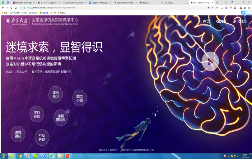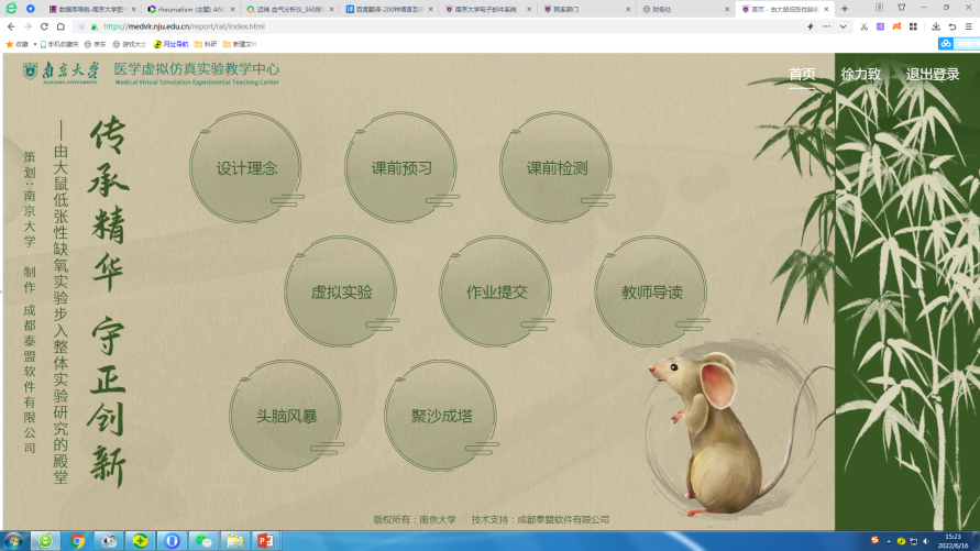 学院建设了medvir.17av.org基础医学虚拟仿真实验平台网站。自主设计多个教学虚拟仿真实验项目以满足目前人才培养需求,鼓励教师和学生在教学活动中做时代的“破局者”,已部署《传承精华,守正创新——由大鼠低张性缺氧实验步入整体实验研究的殿堂》《世界上没有完全相同的两片树叶——由家兔急性坏死性肾病特案学习临床诊疗的预案设计》《迷境求索,显智得识——使用水迷宫系统检测长期微囊藻毒素-LR暴露对小鼠学习认知功能的影响》《知音辨位,显智得识——使用条件恐惧系统检测小鼠学习与记忆》等九个虚拟仿真实验项目。