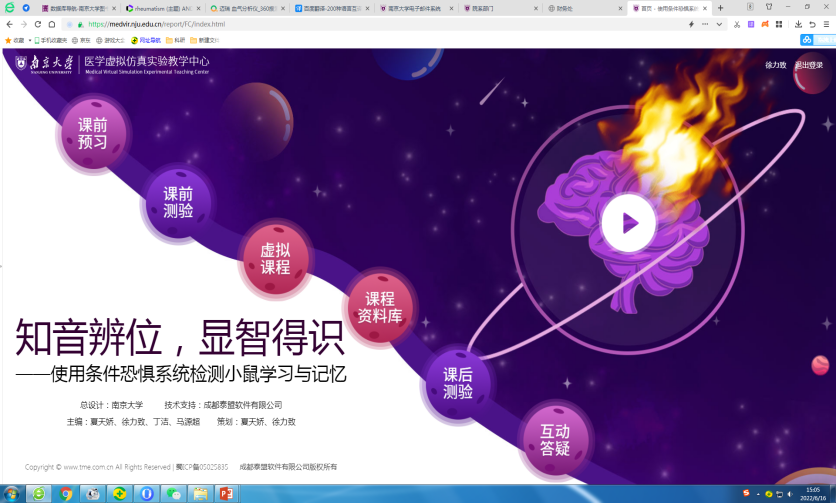 2022年度“高等学校医药类虚拟仿真实验教学项目作品展示”:知音辨位,显智得识——使用条件恐惧系统检测小鼠学习与记忆,三等奖。