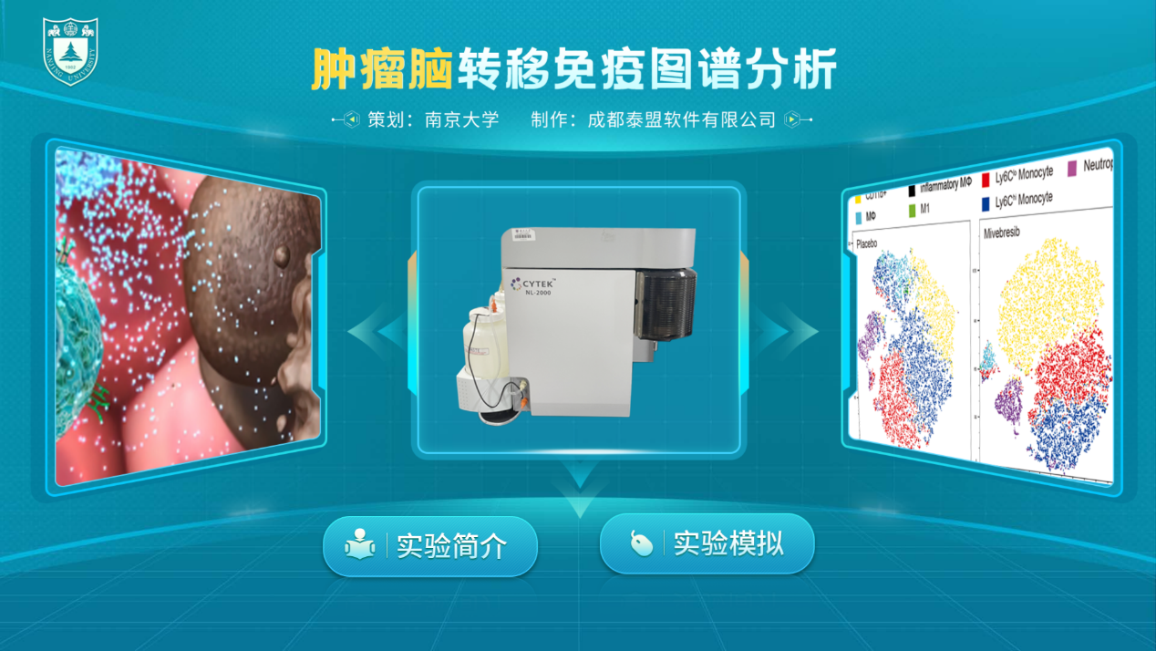 《肿瘤脑转移免疫图谱分析》围绕“肿瘤脑转移患者预后不佳”这一临床问题,基于超多色流式细胞检测技术,结合高维多参数可视化图谱分析,建设了以超多色光谱流式检测实验为核心的虚拟仿真教学项目。